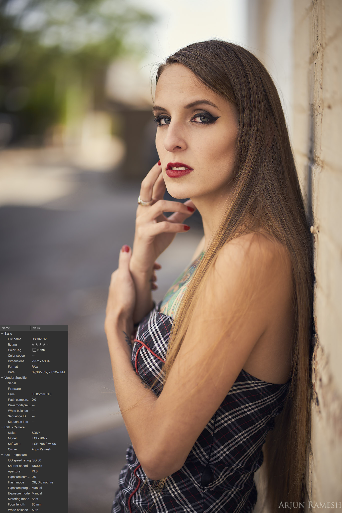Check out the photo below. The location was an alley way. I was new and wanted to challenge myself to create a nice portrait in an unflattering location. There was a large brown dumpster in the background and piles of debris next to the wall. I situated Melynda in such a way so that her head blocked most of the dumpster behind her. The green trees on camera top left weren’t too appealing, either. With a less than ideal background, it was better to isolate the subject and blur the background.