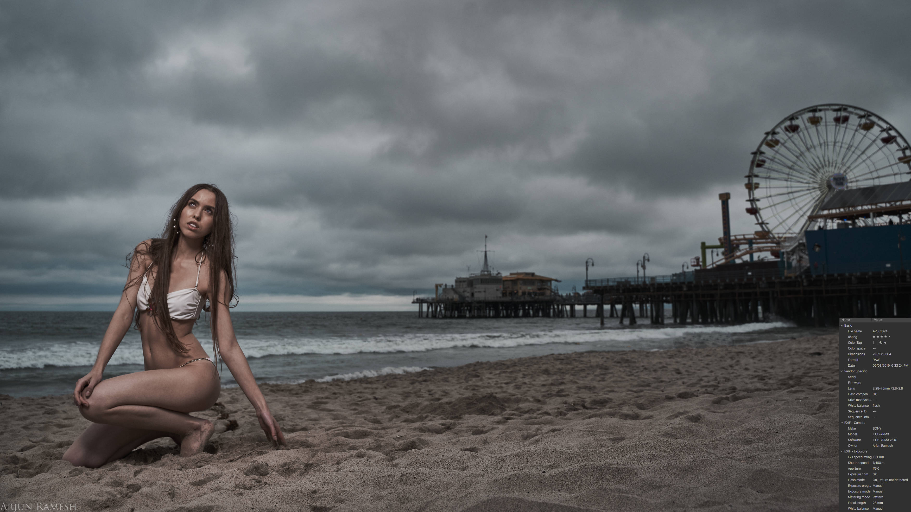 This next photo is where it gets more advanced and may take longer to explain. No, it’s not “Photoshopped.” It was shot on-location. Follow along to know how. I used external lighting to create this image. The background was amazing! Dramatic clouds, crashing waves, the beautiful pier! It would be a pity to exclude it. The iconic Santa Monica Pier gives the photo proper context, rather than only the sand and ocean. There is only one place in the world with this particular pier. Use a good background to your advantage! This was the perfect opportunity to create a dramatic, captivating photograph.